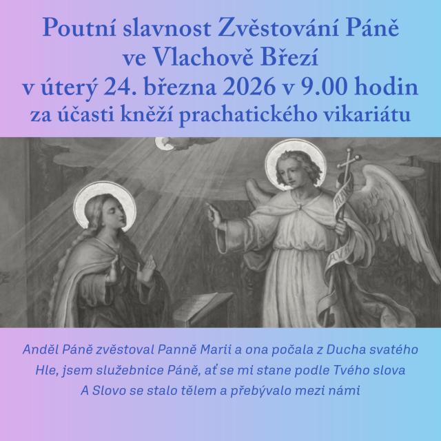 Zveme na poutní mši svatou ze slavnosti Zvěstovaní Páně 24. 3. 2026 v 09:00 hod. v kostele Zvěstování Páně ve Vlachovo Březí za účasti kněží prachatického vikariátu.